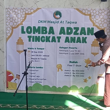 > “Lomba adzan menjadi cara kami menanamkan kecintaan anak-anak dan remaja terhadap ibadah, sekaligus menyemarakkan peringatan Maulid Nabi dengan kegiatan positif,” ujar Nanto krisnadi dan Dedy Kozwara salah satu panitia DKM Musholla At-Taqwa.